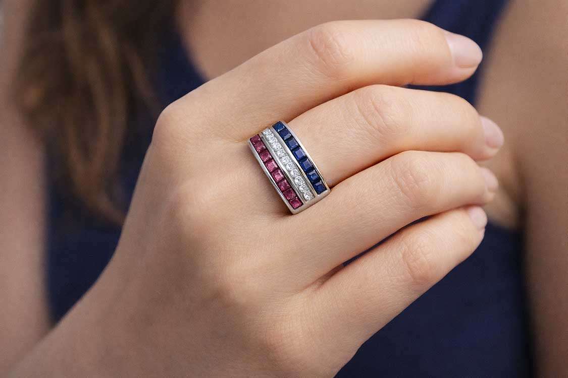 サファイアとルビーとダイヤを用いてお洒落感を演出しています。
